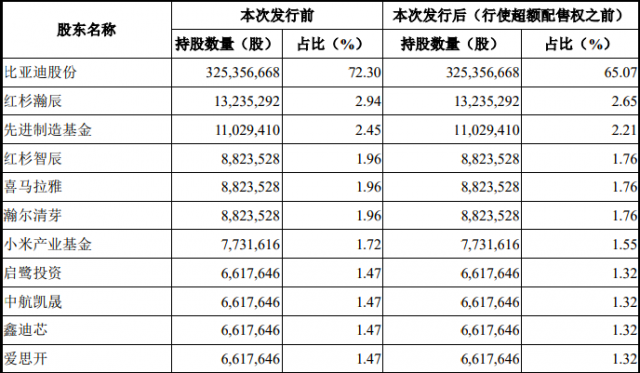 招股书披露,比亚迪持有比亚迪半导体3.25亿股股份,占比亚迪半导体本次发行前股本总额的72.30%,是控股股东。同时红杉、先进制造基金、小米产业基金都是持股比亚迪半导体份额前十的股东。