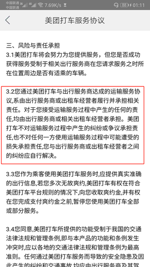 更为明确的是这一句,“美团打车不对运输服务过程中所产生的纠纷或争议承担责任,也不对任何一方使用运输服务过程中可能遭受的损失承担责任,乘客与出行服务商或出租车经营者之间的纠纷应自行解决。”在这里,美团打车只是一个将出行服务商与乘客连接起来的纽带,但当出现问题时,纽带就不再起到原本的作用。