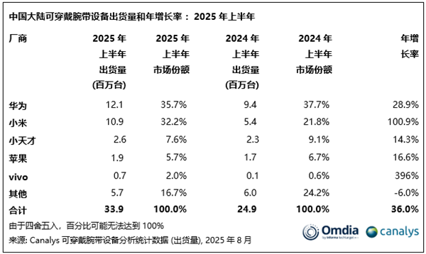 9月10日消息,据Canalys(现并入Omdia)最新数据显示,2025年上半年,中国大陆可穿戴腕带设备出货量飙升至3390万台。