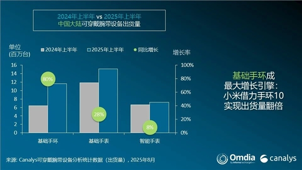 一举创下该市场上半年度出货量的历史新纪录,这一数据相比2024年上半年同比增长36%,基础手环品类以80%的惊人增速成为增长最快的细分市场。