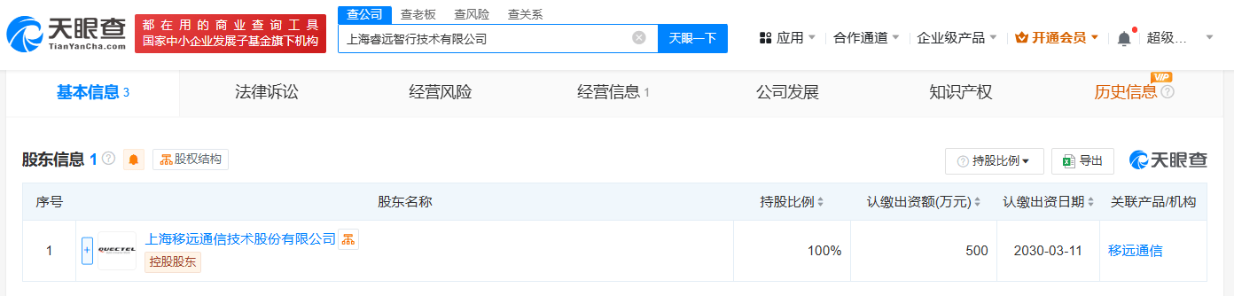 天眼查App显示,近日,上海睿远智行技术有限公司成立,法定代表人为王敏,注册资本500万人民币,经营范围包括智能车载设备制造、智能车载设备销售、5G通信技术服务、电子元器件制造等。股东信息显示,该公司由移远通信(603236)全资持股。
