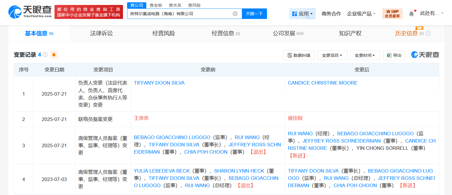 天眼查App显示,近日,英特尔集成电路(海南)有限公司发生工商变更,TIFFANY DOON SILVA卸任法定代表人、董事长,由CANDICE CHRISTINE MOORE接任,同时,部分主要人员也发生变更。
