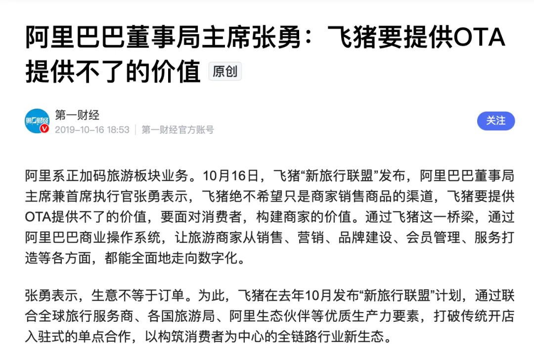 回到2019年,时任阿里巴巴董事局主席张勇曾对飞猪寄予厚望,他说飞猪要提供OTA提供不了的价值,构筑以消费者为中心的行业新生态。