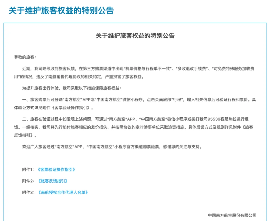去年三月,三大航就集体发了维护旅客权益的公告。南航的公告里直接提到,第三方购票渠道“机票价格与行程单不一致”、“多收退改手续费”、“对免费特殊服务加收费用”等情况,违反了南航销售代理协议的相关约定,严重损害了旅客权益。