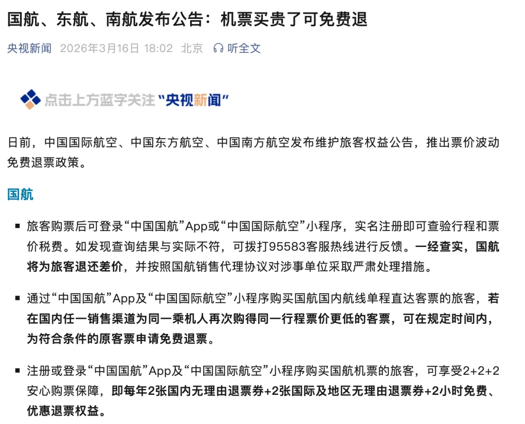今年3月13日,三大航再一次发布旅客权益保障专项行动,再次围绕票价波动、误购错购等旅客反馈集中的问题,推出便利政策。