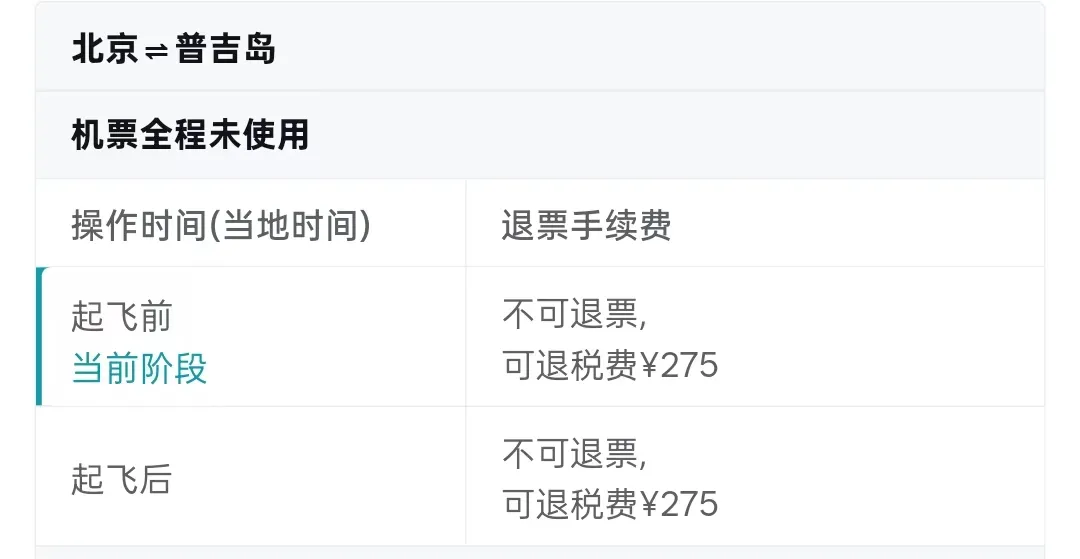 我在航司官网也查了下,这趟航班由中国国航执飞。国航的规定是北京前往普吉岛不可退票,但普吉岛回北京是可以退票的,只收取600元的自愿退票手续费。