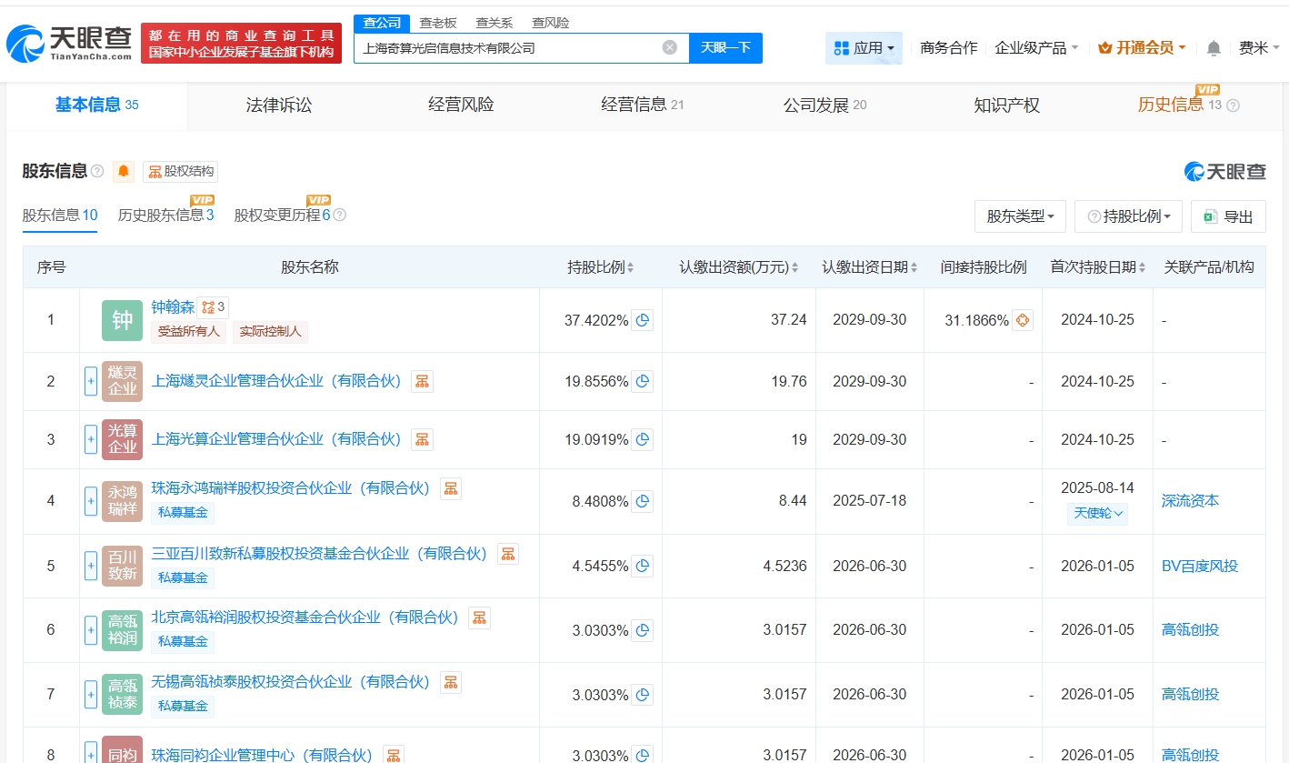 近日,上海奇算光启信息技术有限公司发生工商变更,新增百度旗下三亚百川致新私募股权投资基金合伙企业(有限合伙)、上海张江燧玥创业投资合伙企业(有限合伙)、无锡高瓴祯泰股权投资合伙企业(有限合伙)等为股东,同时,注册资本由约84.4万人民币增至约99.5万人民币,同时部分主要人员发生变更。