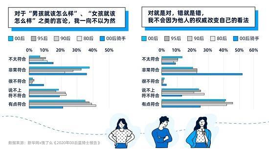 相比80、90后,00后群体整体对于外界所谓的权威和一些固有价值观并不感冒。尤其是00后蓝骑士,他们中超过半数“不会因为他人权威而改变自己的看法”。也因此在选择工作时,00后群体更在乎这份工作“是否是自己喜爱的”。对00后蓝骑士来说,这一点的重要程度甚至超过了“工资是否丰裕”。