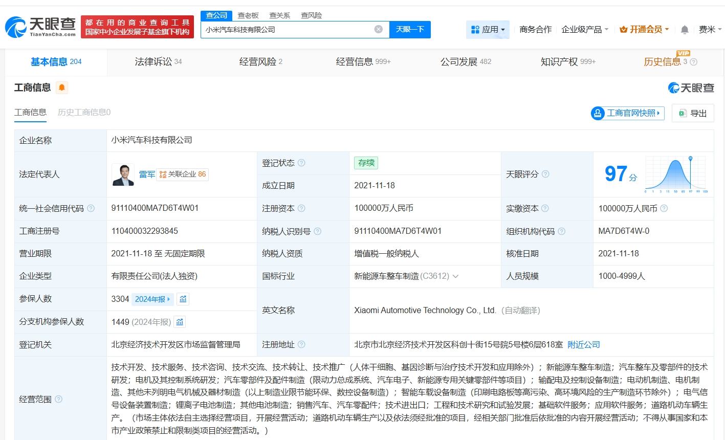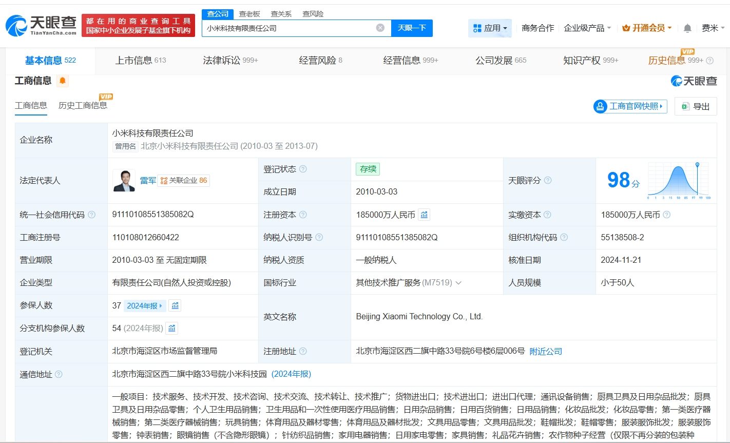 天眼查知识产权信息显示,小米科技有限责任公司已成功注册多枚“XIAOMI SU7”商标,国际分类包括地毯席垫、通讯服务、厨房洁具等。