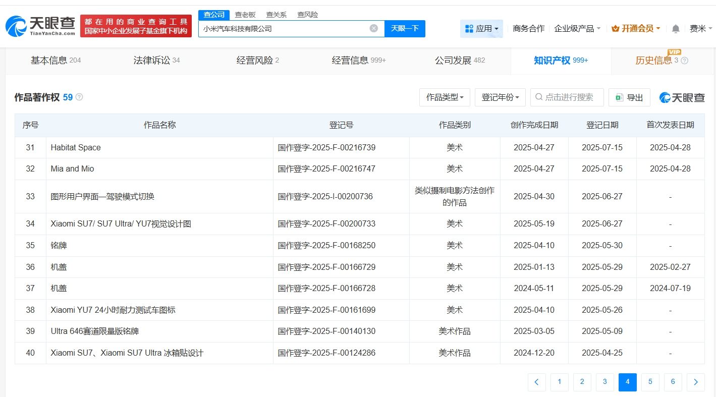 天眼查知识产权信息显示,小米科技有限责任公司已成功注册多枚“XIAOMI SU7”商标,国际分类包括地毯席垫、通讯服务、厨房洁具等。此外,小米汽车科技有限公司已登记“Xiaomi SU7/ SU7 Ultra/ YU7视觉设计图”、“Xiaomi SU7、Xiaomi SU7 Ultra 冰箱贴设计”等作品著作权。