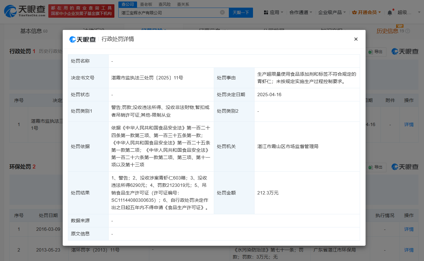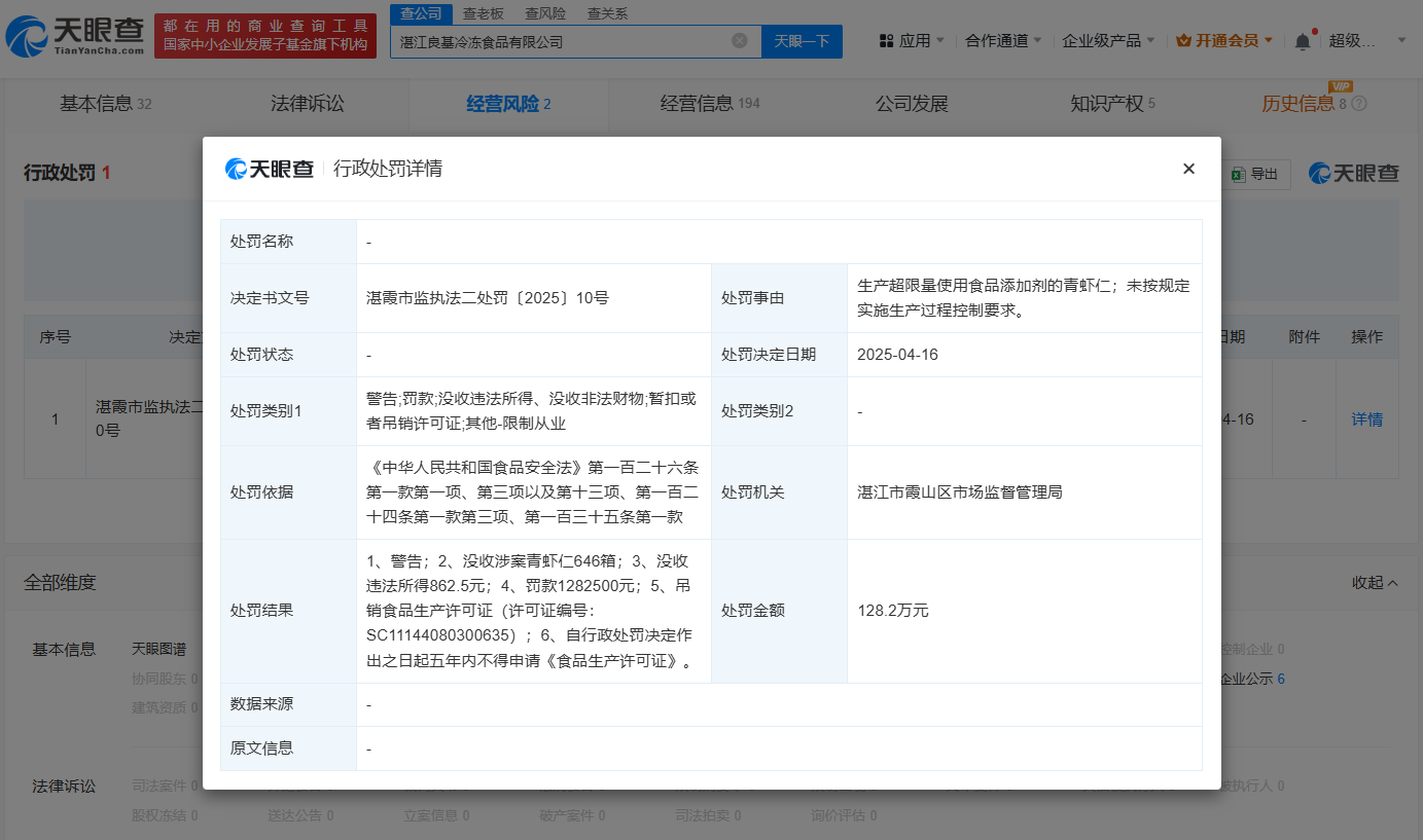 天眼查深度风险信息显示,近日,315曝光的多家保水虾仁涉事公司因生产超限量使用食品添加剂的食品,被市场监管部门没收涉案虾仁并进行处罚。其中,湛江宝辉水产有限公司被没收违法所得6290元,罚款212.3万余元,并吊销食品生产许可证;湛江良基冷冻食品有限公司被没收违法所得862.5元,罚款128.25万元,并吊销食品生产许可证;湛江尚方舟食品有限公司被没收违法所得248.8元,罚款226.4万元,并吊销食品生产许可证,目前该公司已被列入严重违法失信企业名单;湛江中青海洋水产有限公司被没收违法所得416元,罚款181.85万余元,并吊销食品生产许可证,对该公司法定代表人李某某罚款19.44万元、主要负责人陈某罚款37.2万余元。