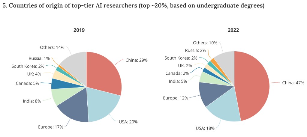 美国保尔森基金会内部智库MacroPolo今年发布的《全球AI人才追踪报告》显示,从出身的本科院校来看,2022年中国高校几乎培养了全球一半(47%)的顶尖人工智能研究人员。