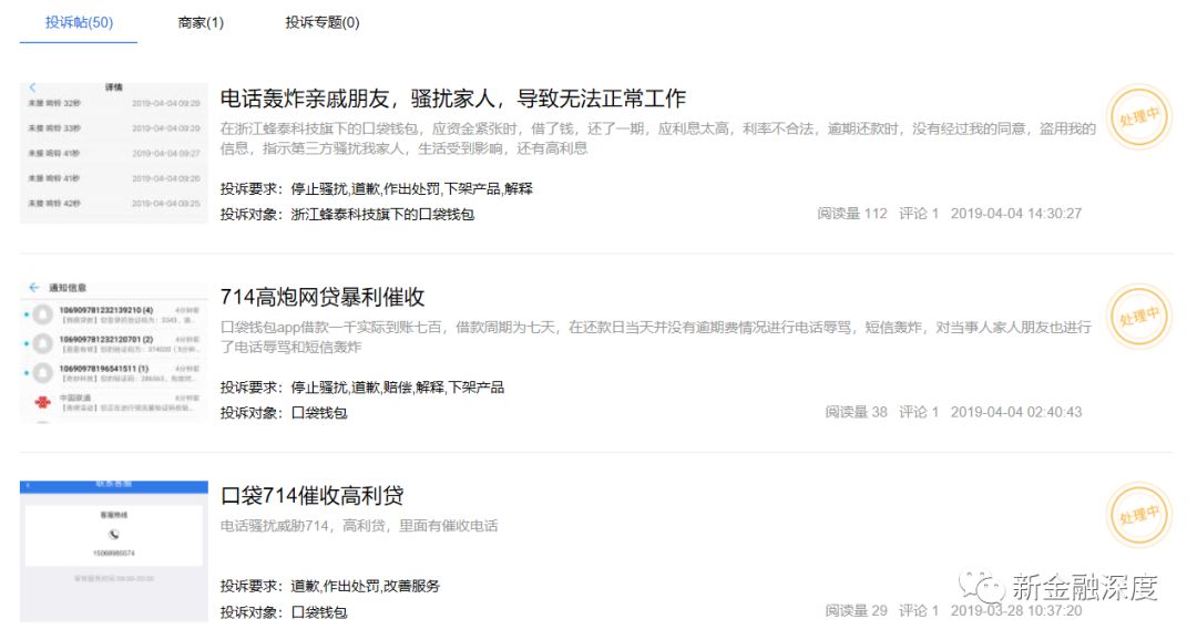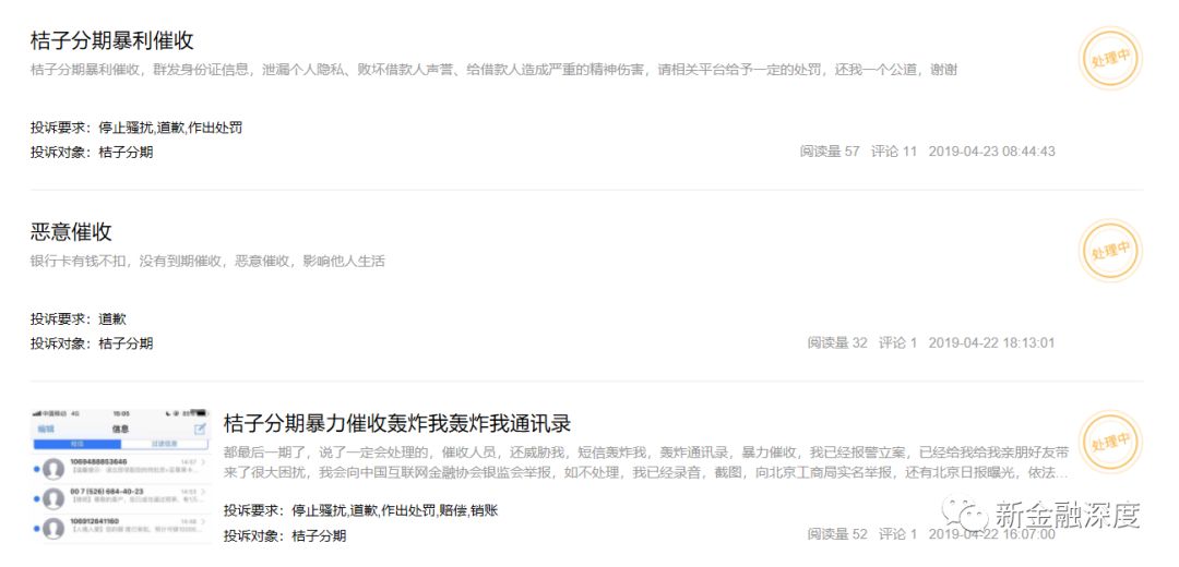 新金融头条发现,在网络投诉平台上,和蜂泰科技运营的APP端产品口袋钱包、分期商城桔子分期相关的投诉帖数量众多,投诉内容涉及暴力催收和高利贷。