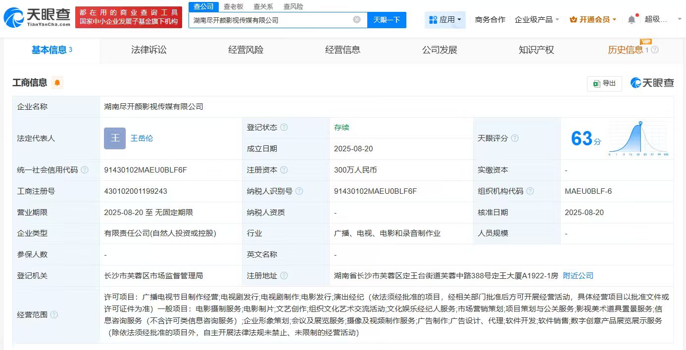 天眼查工商信息显示,近日,湖南尽开颜影视传媒有限公司成立,法定代表人为王岳伦,注册资本300万人民币,经营范围包括广播电视节目制作经营、电视剧发行、电视剧制作、电影发行、演出经纪等。股东信息显示,该公司由李湘和王岳伦分别持股99%、1%。