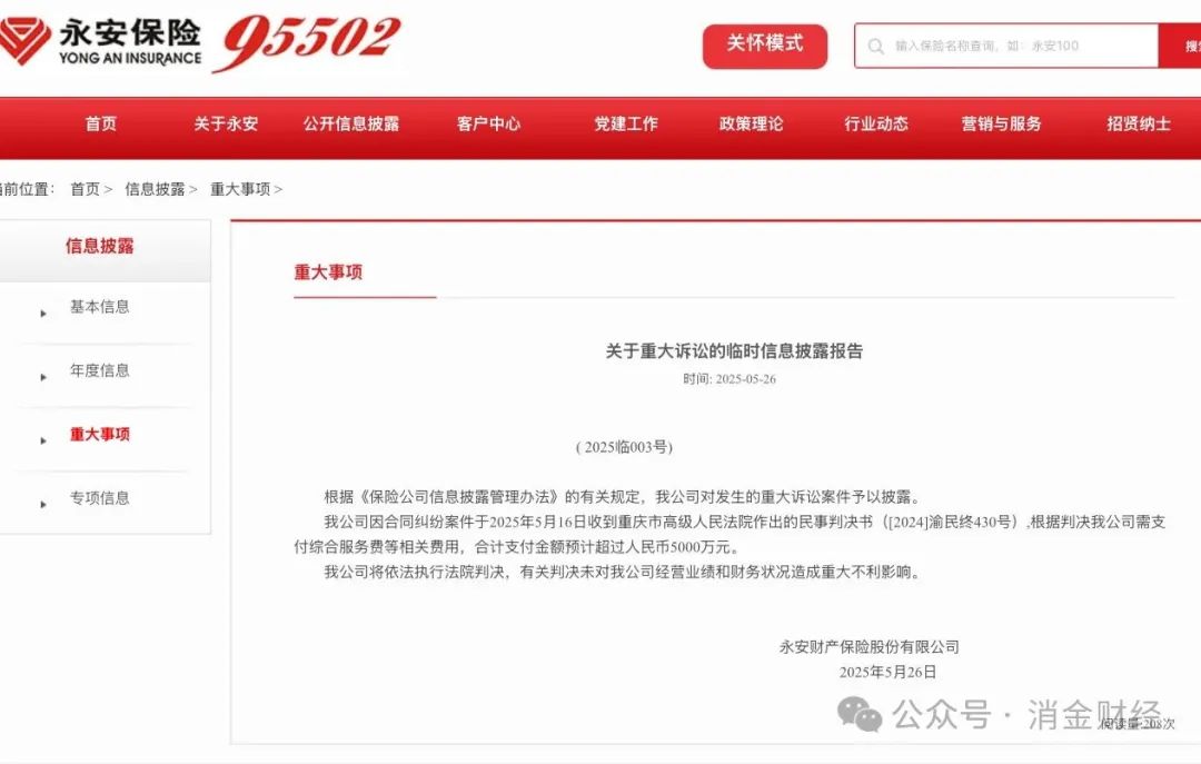 5月26日,永安财险披露重大诉讼报告称,重庆市高级人民法院已于5月16日作出终审判决,要求其向马上消金支付综合服务费及相关费用合计超5000万元。这一金额相当于永安财险2024年全年净利润(2.04亿元)的四分之一以上,对其财务状况形成显著压力。诉讼原标的金额高达1.4亿元,虽终审赔偿额较一审减少,但仍对刚摆脱“净利润四连降”的永安财险造成重击。