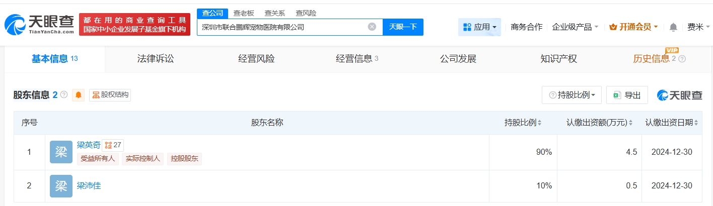 天眼查App显示,涉事医院深圳市联合鹏辉宠物医院有限公司成立于2024年7月,法定代表人为梁英奇,注册资本5万人民币,经营范围为宠物服务、动物诊疗,由梁英奇、梁沛佳共同持股。