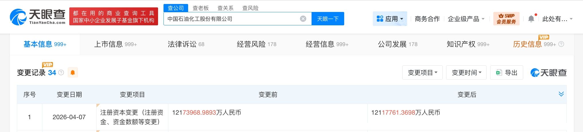 天眼查工商信息显示,近日,中国石化(600028)发生工商变更,注册资本由约1217.4亿人民币减至约1211.8亿人民币。