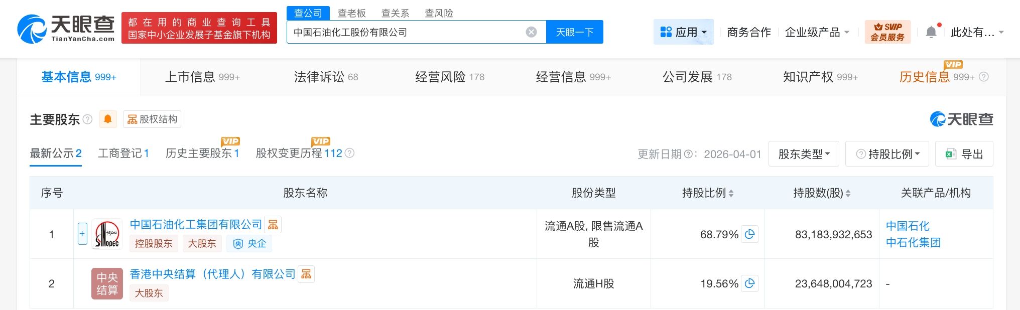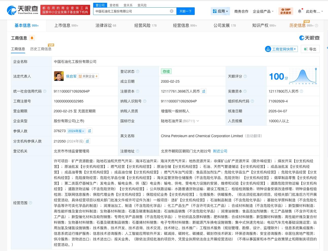 中国石油化工股份有限公司成立于2000年2月,法定代表人为侯启军,经营范围包括矿产资源勘查、陆地石油和天然气开采、化工产品销售等。股东信息显示,该公司由中国石油化工集团有限公司、香港中央结算(代理人)有限公司等共同持股。