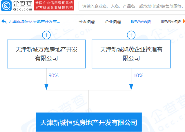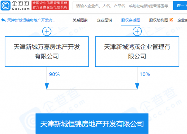 天津新城恒昇房地产开发有限公司、天津新城恒弘房地产开发有限公司、天津新城恒锦房地产开发有限公司成立,三者皆由天津新城万嘉房地产开发有限公司、天津新城鸿茂企业管理有限公司共同持股,企查查股权穿透显示。
