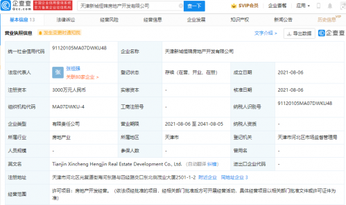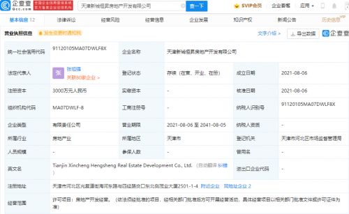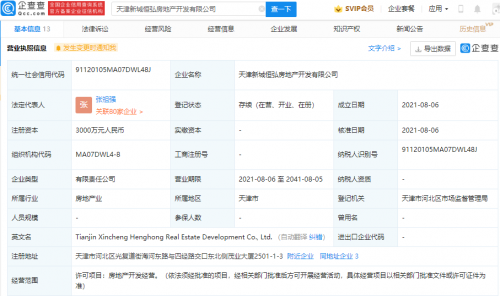 【TechWeb】企查查APP显示,8月6日,天津新城恒昇房地产开发有限公司、天津新城恒弘房地产开发有限公司、天津新城恒锦房地产开发有限公司成立,法定代表人同为张祖强,注册资本均为3000万元人民币,经营范围均为房地产开发经营。