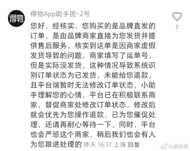 经平台核实,该订单系品牌方(企业商家)直接发货,货物不经过平台。但该商家涉嫌虚假发货,并且无法继续发货。