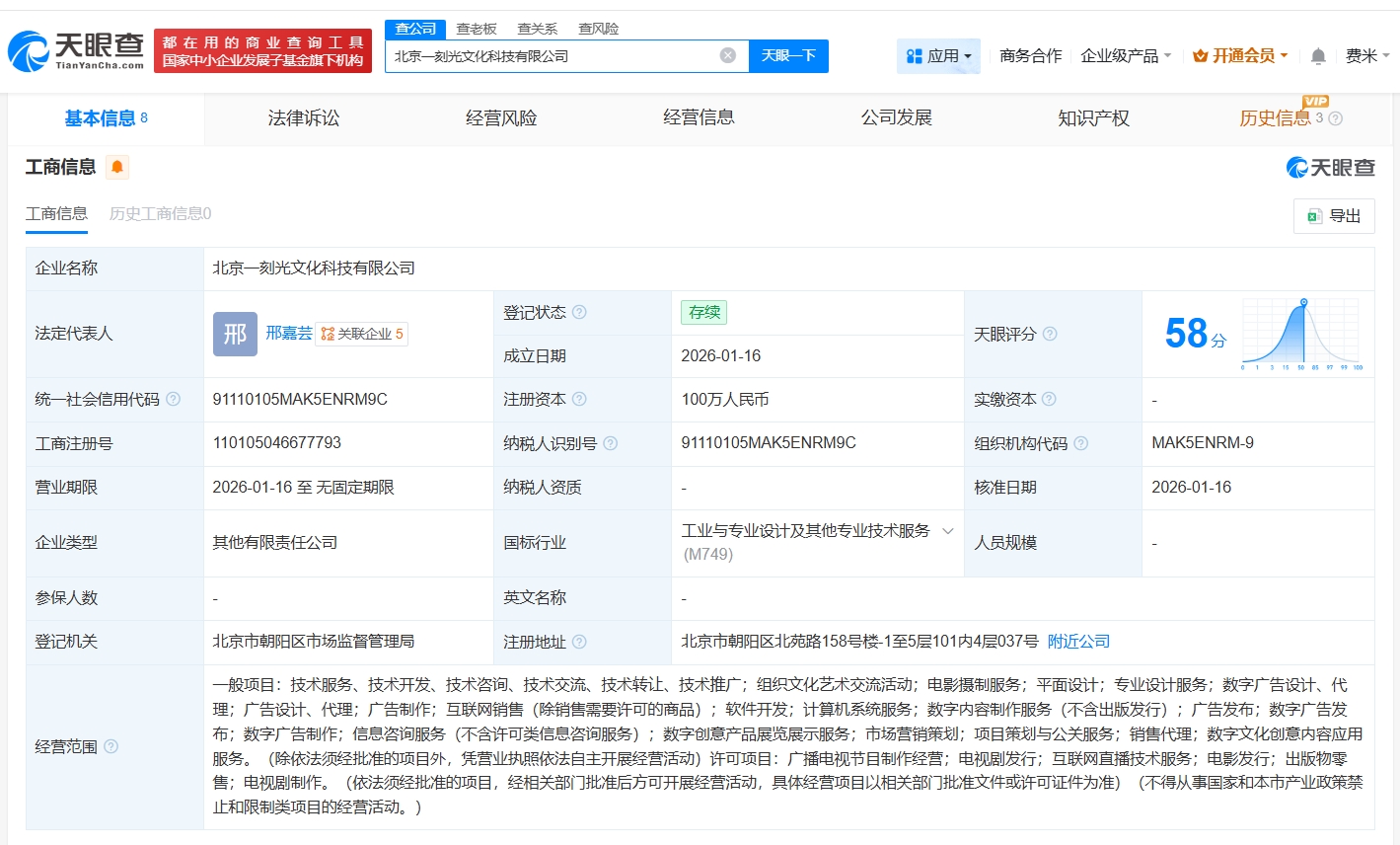 天眼查工商信息显示,近日,北京一刻光文化科技有限公司成立,法定代表人为邢嘉芸,注册资本100万人民币,经营范围包括组织文化艺术交流活动、电影摄制服务、平面设计等。股权全景穿透图显示,该公司由光线传媒(300251)旗下北京光线影业有限公司、余志刚共同持股。