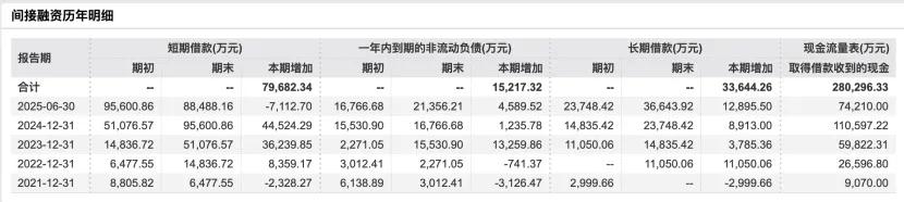 规模扩张需要巨额资金投入,万辰集团近几年的融资水涨船高。数据显示,2021年-2024年、2025H1各期末,公司短期借款分别为6477.55万元、1.48亿元、5.11亿元、9.56亿元和8.85亿元;一年内到期非流动负债分别为3012.41万元、2271.05万元、1.55亿元、1.68亿元和2.14亿元;长期借款也从2021年末的0逐步增加至今年半年度末的3.66亿元。