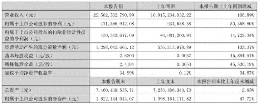 半年报显示,上半年,公司实现营业收入225.83亿元,同比激增106.89%;归母净利润4.72亿元,同比增幅高达50358.80%。