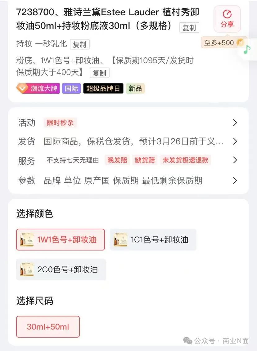 “大牌低价”是饷店的获客利器之一。在平台页面“最后疯抢”列表下,有多个大牌产品以低价销售。例如,处于特卖阶段的植村秀卸妆油50ml加持妆粉底液30ml套装价格仅为165元,而三大主流电商平台仅该款粉底液价格即在260元左右。