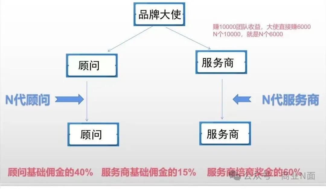 当服务商达成“滚动90天内培育奖金3500元、个人销售收益6000元”,完成审核后可晋升为大使。大使卖货佣金比顾问提升40%,可以提伞下所有顾问销售佣金的40%、伞下所有服务商基础销售佣金的15%,伞下所有服务商团队收益的60%,以及直属大使销售佣金的10%和直属大使团队收益的30%。