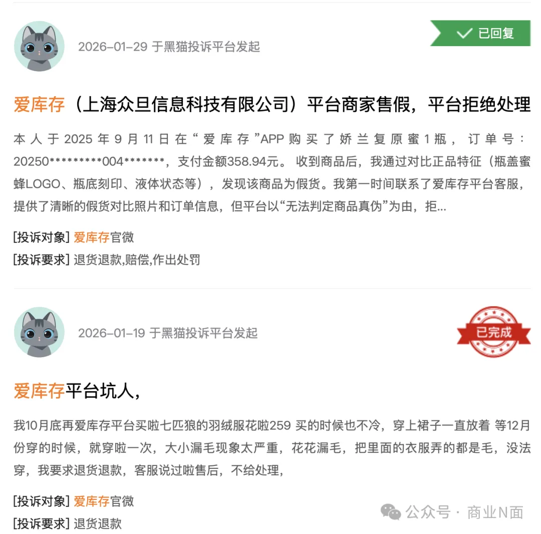在黑猫投诉,以“饷店”“爱库存”为关键词搜索,分别约有400条、1700条,浏览前100条投诉内容,以质量问题、疑似假货居多。爱库存是梦饷集团的起家平台,目前定位于“服务店主、主播、团长的供货平台”“梦饷科技”微信公众号此前名称即为“爱库存”。