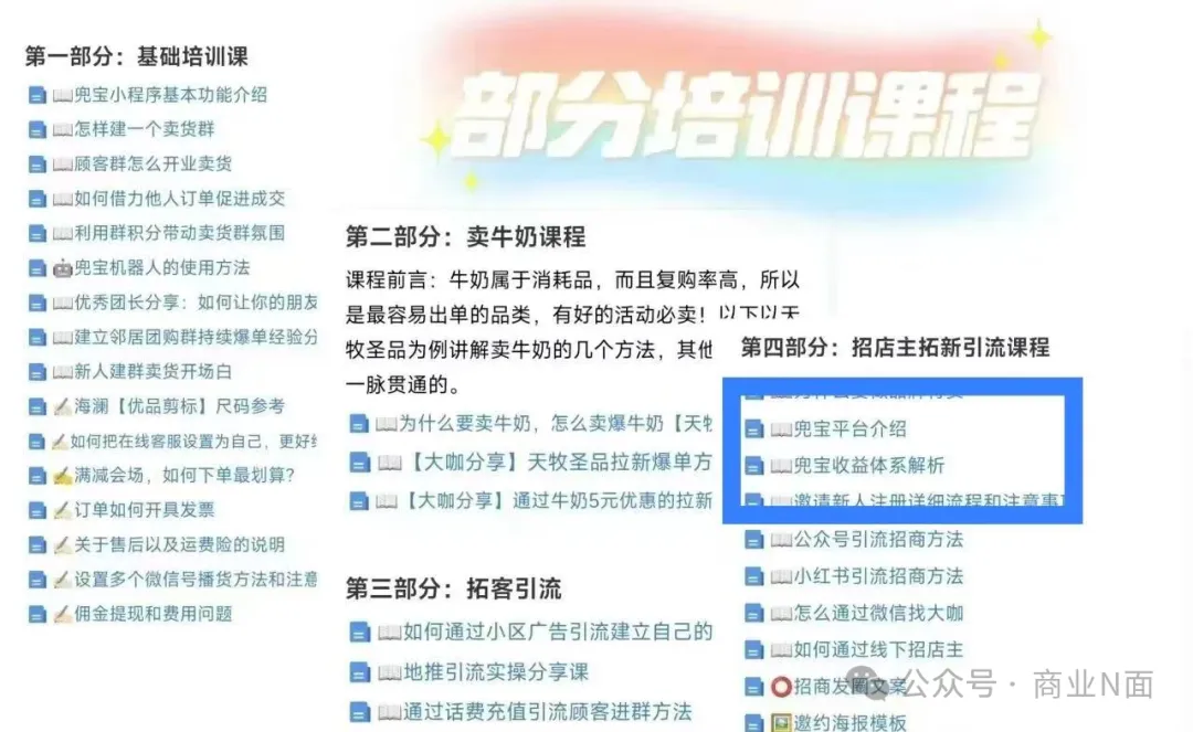 其四,虽然删除了两大课程,但在最新“团队百宝箱”——“招商发圈文案”下,仍然存在“兜宝母公司梦饷集团”等表述,以及部分佣金体系介绍。