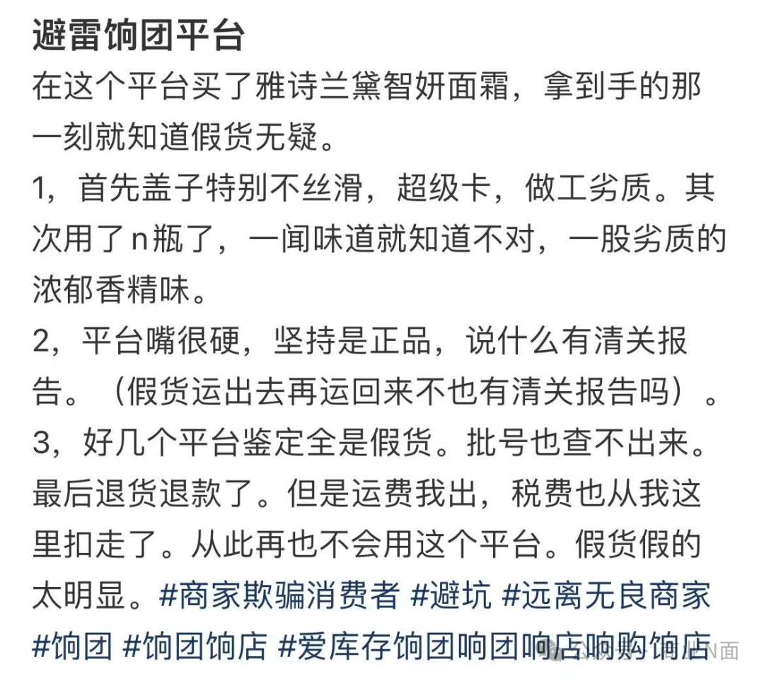 例如,今年3月1日,在小红书,有用户表示,在饷团购买雅诗兰黛智妍面霜,到手后发现做工劣质、味道不对,在第三方平台检测后,显示“不符合正品工艺”。反馈后,商家称可以通过掌上海关查询商品真伪,如依旧不放心,可以申请退货。该用户认为,假货可以先运出去再清关回售,并不能确认真伪,因此选择退货,但自己承担了运费及税费。