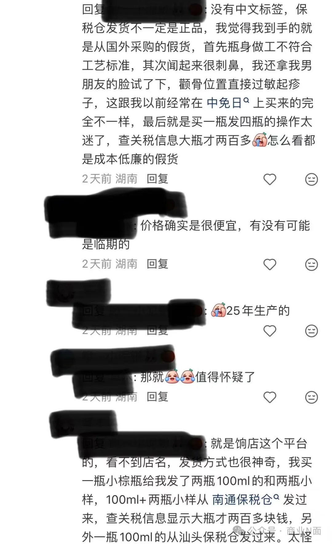 该笔记下方,多位消费者均表示自己在饷店平台疑似买到假货,存在瓶身不符合工艺标准、味道刺鼻、发货方式奇葩等状况。
