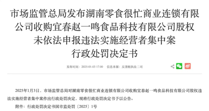 不仅如此,2025年1月3日,国家市场监督管理总局对鸣鸣很忙处以175万元罚款,认定其在2023年11月10日完成对赵一鸣零食的股权变更前,未依法进行经营者集中申报。另外,鸣鸣很忙也曾因食品安全问题被相关部门通报。2024年8月,广东省市场监督管理局披露关于13批次食品不合格情况的通告,其中有2批来自于赵一鸣零食店。在黑猫投诉平台上,加盟店在售商品产品过期、食品中有异物、店员服务问题等投诉更是比比皆是。