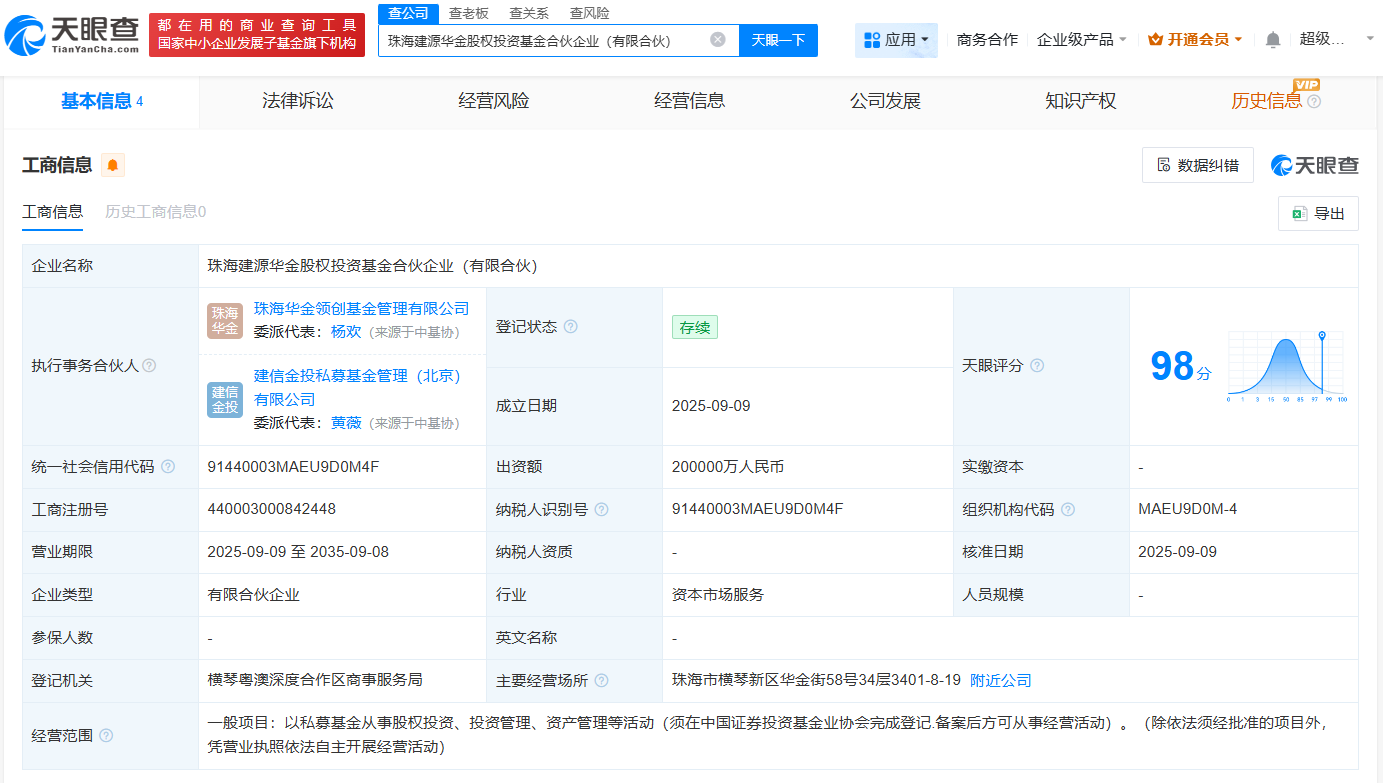天眼查工商信息显示,近日,珠海建源华金股权投资基金合伙企业(有限合伙)成立,执行事务合伙人为珠海华金领创基金管理有限公司、建信金投私募基金管理(北京)有限公司,出资额20亿人民币,经营范围包括以私募基金从事股权投资、投资管理、资产管理等活动。合伙人信息显示,该基金由珠海市新质生产力投资基金合伙企业(有限合伙)、建信金融资产投资有限公司等共同出资。