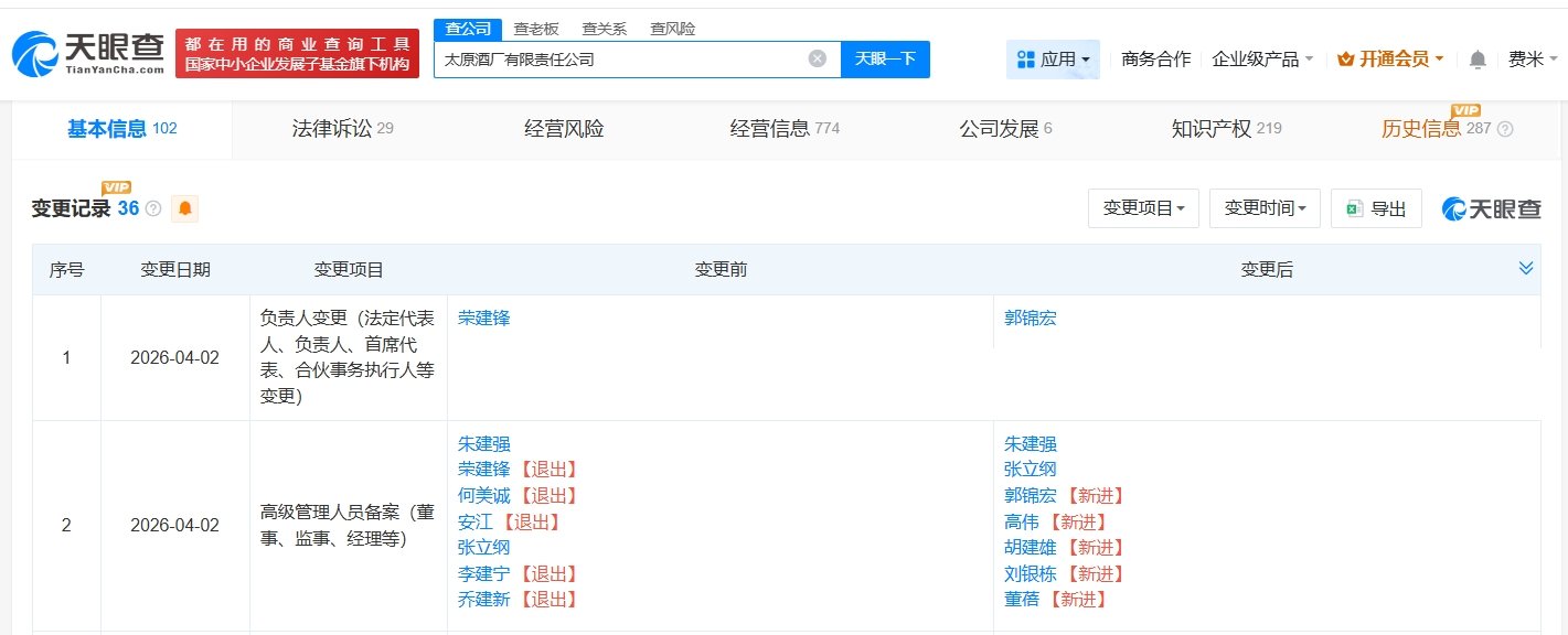 天眼查App显示,近日,太原酒厂有限责任公司发生工商变更,荣建锋卸任法定代表人、董事长,由郭锦宏接任。同时,多位高管发生变更。