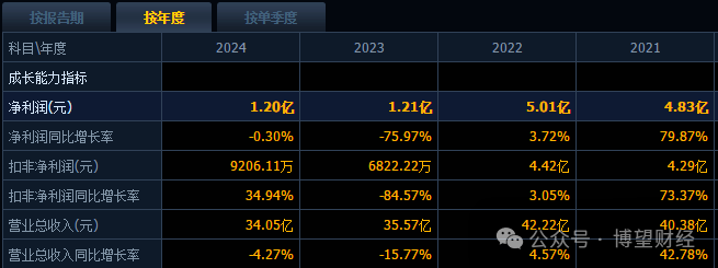 2023年与2024年连续两年承压,2023年营收与净利润分别下降15.77%和75.97%;2024年虽降幅收窄,但颓势未改,营收同比下滑4.27%,净利润同比减少0.3%。