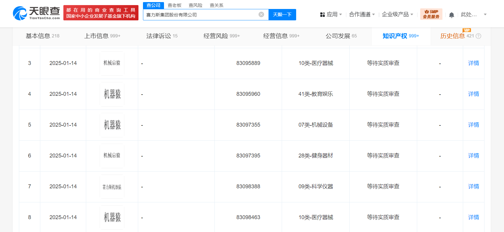 天眼查知识产权信息显示,近日,赛力斯集团股份有限公司申请注册“赛力斯机器猿”“机器猿”“机械启猿”商标,国际分类含科学仪器、运输工具、机械设备等,当前商标状态均为等待实质审查。
