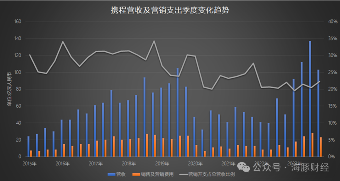 实际上,携程的业绩复苏部分归功于疫情后人们外出度假及商务出行需求的强烈反弹,另一个重要因素则是,携程2020年采取了大刀阔斧的降本增效措施。其中,最突出的就是大幅削减营销开支,2018年-2019年,携程营销开支分别为95.96亿元和92.95亿元,分别占当年总营收的31%和26%;2020年-2022年,携程营销开支分别为44.05亿元、49.22亿元、42.50亿元,比此前下降了近50%。2023年,携程销售及营销费用为92亿元,虽然比疫情三年上涨较大,但占总营收比例仅为21%,低于疫情前的数据。