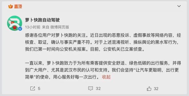 而昨日,萝卜快跑官方表示,近日出现的恶意投诉、虚假事故等网络内容,经核查、取证,确认与事实严重不符,“对于上述混淆视听、操纵舆论的黑水军行为,我们已第一时间向公安机关报案”。
