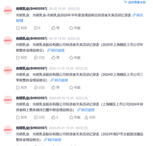 根据光明乳业自己发布的《投资者关系活动记录表》显示,去年以来长达一年多时间里,除了业绩发布会或集体业绩说明会等活动之外,光明乳业发布的投资者关系活动记录表上,并无一家券商、基金或其他投资者主动上门进行调研。