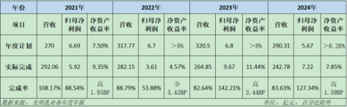 从光明乳业历年的年报来看,该上市公司每年年初都会提出当年度的经营计划,从营收指标、归母净利润指标、净资产收益率等均设定了详细的数值。