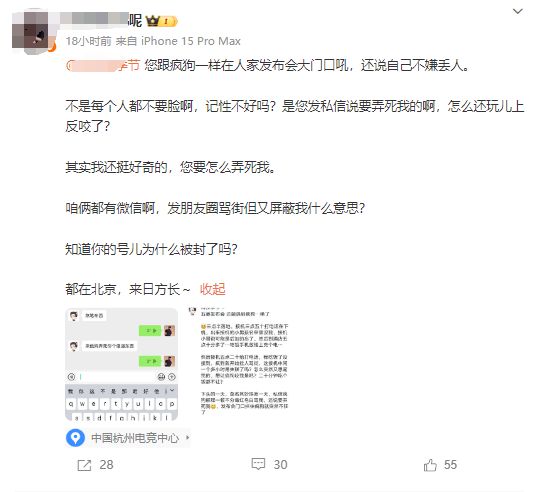 起初不过是个小插曲,双方顺利抵达现场本该就此翻篇。没想到69万粉丝的博主率先在微博点名对方,“挂人”开麦,154万粉的博主随即回怼,双方开启“疯狗式互咬”,从线上撕到线下,甚至在发布会入口当场对骂,引来不少观众围观,而且完全不顾公关在旁边劝架。