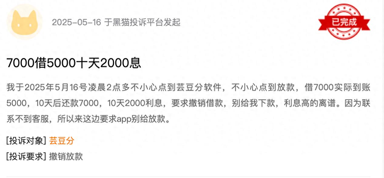 在被投诉中,很大一部分信息指向高利贷。有用户称,借5000元,10天后要求还款7000元,真实借贷成本同样高达1460%。看到如此高利贷后,这名用户急呼:求芸豆分APP别给我下款,但联系不到客服......