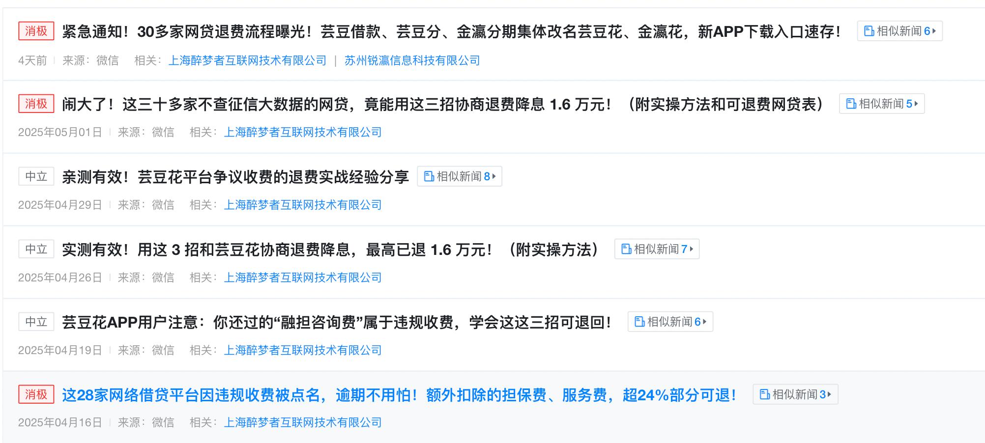 而在上海醉梦者互联网技术有限公司(天眼查界面)新闻舆情一栏,可以清晰看到“芸豆借款、芸豆分更名为芸豆花”的信息。另有“芸豆退费”微信,也佐证了这个消息。