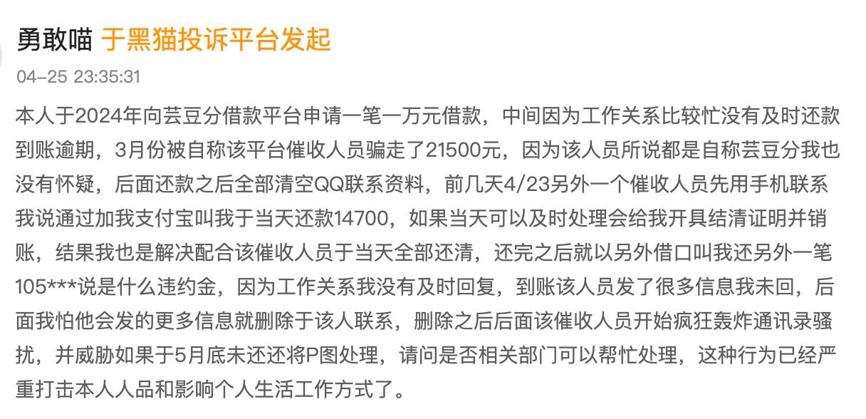 还有用户直言,自己2024年借款1万,因工作忙逾期被平台催收介入还款21500。接着另一催收要求该用户还款14700元,等该用户还清之后,又要求该用户付违约金.....粗略计算,短短一年,该用户借款1万,还款3.6万,还没还清,真实成本已经无法计算。