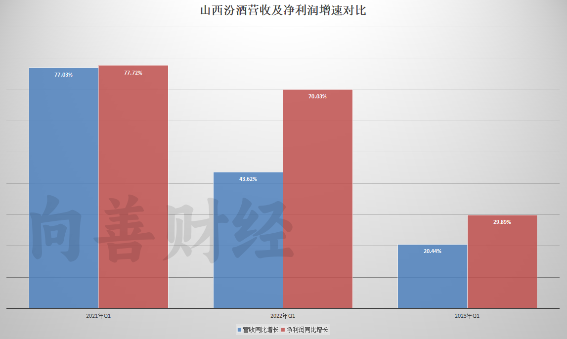 根据山西汾酒一季度财报数据显示,不管是营收的增长速度,还是净利润的增长速度,都已经下降到了30%以下,同比2021年一季度数据,彼时的营收增长以及净利润增长皆保持在70%以上。两相对比,差距悬殊。