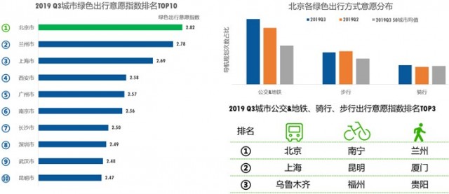 《报告》指出,第三季度,北京的绿色出行意愿最高,其次为兰州市、上海市、西安市、广州市、南京市、长沙市、深圳市、武汉市、昆明市。