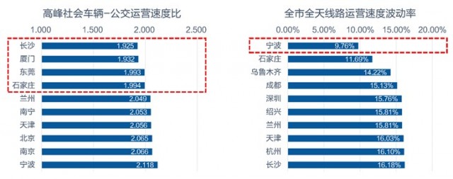 《报告》指出,从细分指标看,将公交运营速度与同时段、同线路的社会车辆速度进行对比,能够较直接、客观地反映公交运行效率与城市交通效率的相对水平,值越小表示两者速度差距也越小。